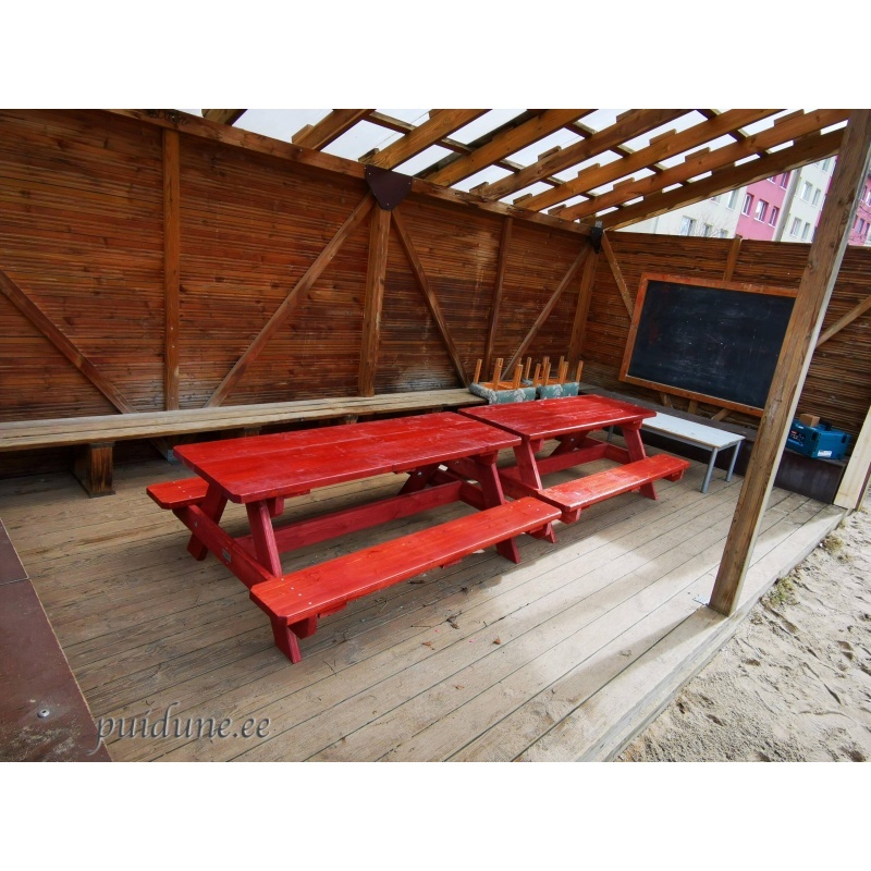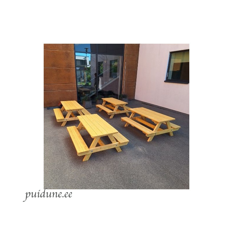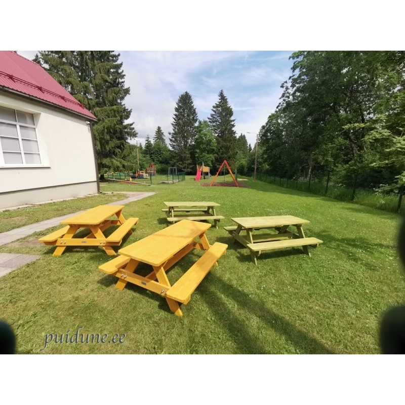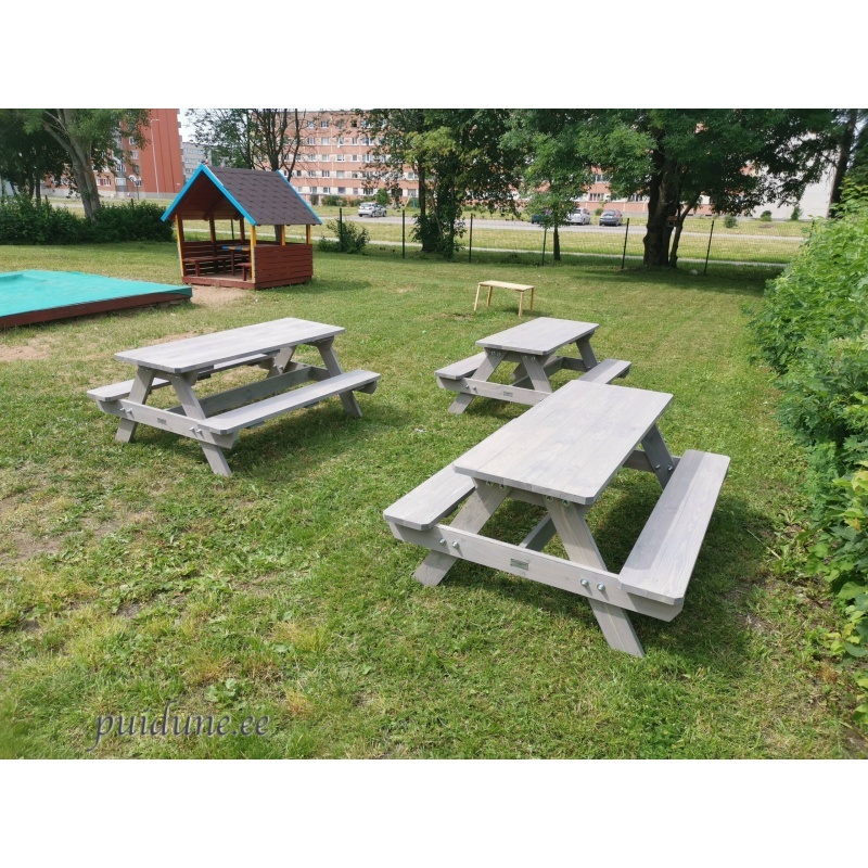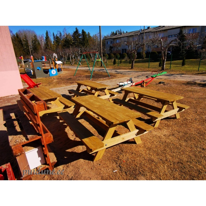 Pere pisematele liikmetele mõeldud klassikaline piknikulaud. Pildil olev laud mahutab 6-8 last vanuses 2-10a. Materjaliks kasutame 28mm paksust tugevsorteeritud höövelmaterjali DRS ja 45x95mm ristlõikega tugevsorteeritud höövelprusse konstruktsioonis. Laua mõõdud on ca 135x120x62cm (pikkus x laius x kõrgus).