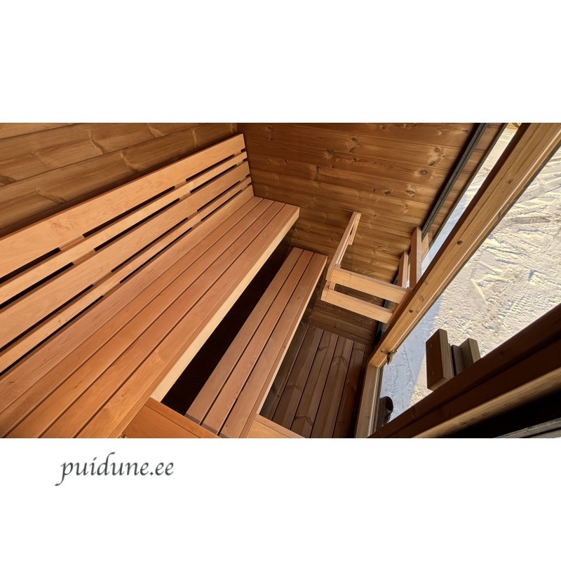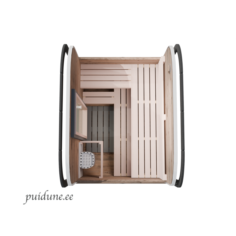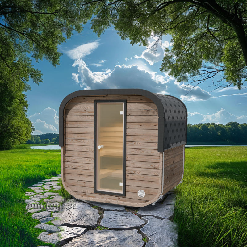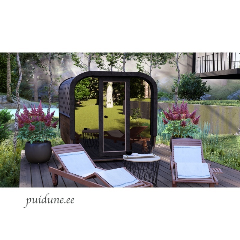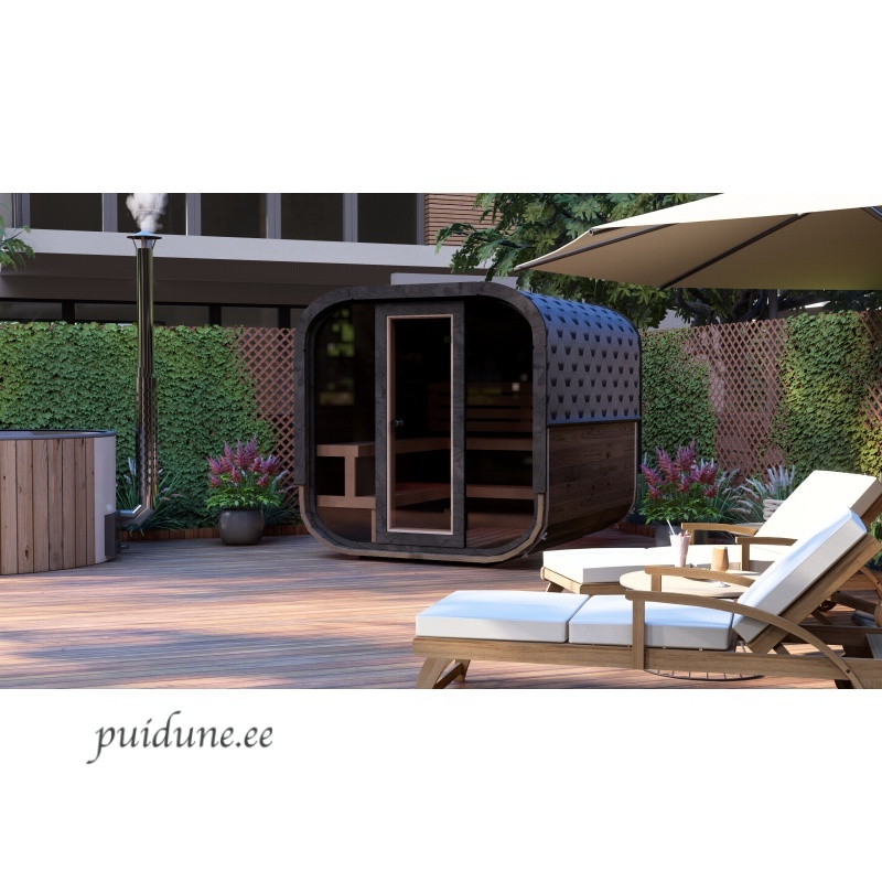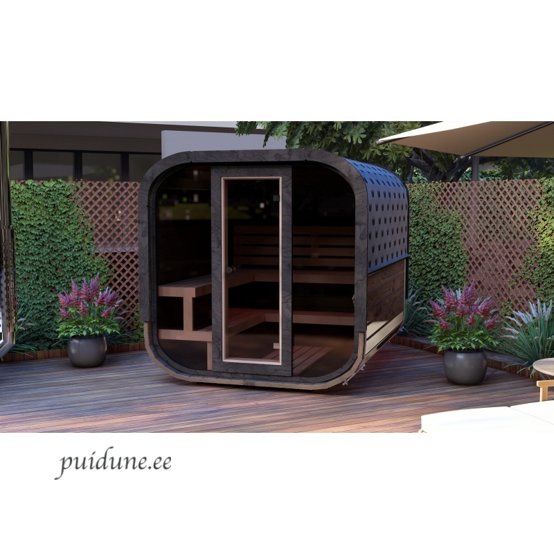 See neljakandiline, ümarate nurkadega saun on kujundatud nagu kuubik ja sobib 2-3 inimesele. Saunal on mugav L-kujuline lava ja seljatoed, mis võimaldavad saunatajal mugavalt selga sirutada. Saun on saadaval kahes variandis: klaasist esiseinaga, mis pakub avarat vaadet, või klaasukse ja puitseinaga, mis tagab privaatsuse. Kompaktne ja stiilne disain teeb sellest suurepärase valiku igasse aeda või terrassile.